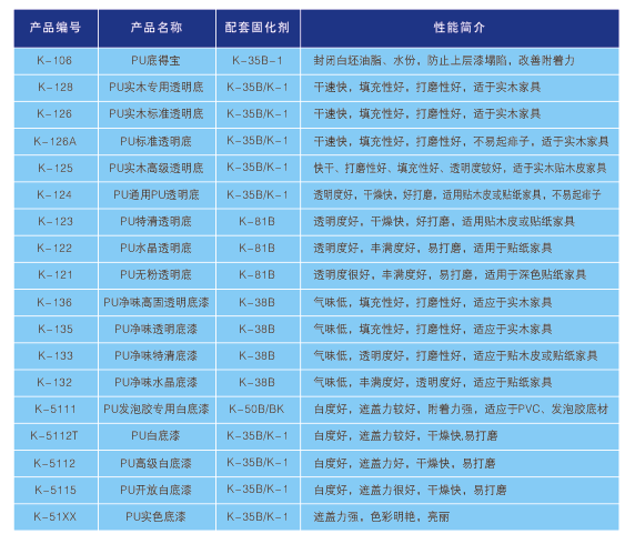 5.K130.K132:具有优异的透明度和硬度,耐黄变性能优异,是最优良的贴纸家具专用底漆。
