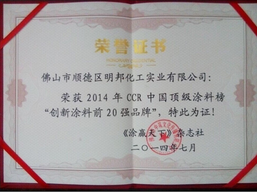 El 7 de julio, se celebró en 2014 China mejores Shunde RCC pintura lista la publicación y la comercialización de la pintura de la Cumbre con China ", durante el mismo período, también se publicó el revestimiento civil de pintura, muebles, la madera y el agua, los niños de la pintura, la prueba de pintura, como Las de barro la pluralidad de la lista, que mingbang Chemical ganó el mejor pintura china lista RCC 2014" el honor de la marca de dinero de pintura 20 ".